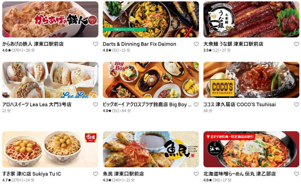 その他の津市のレストランは、Uber Eatsのアプリをダウンロードして配達先住所を入力すれば確認できます。